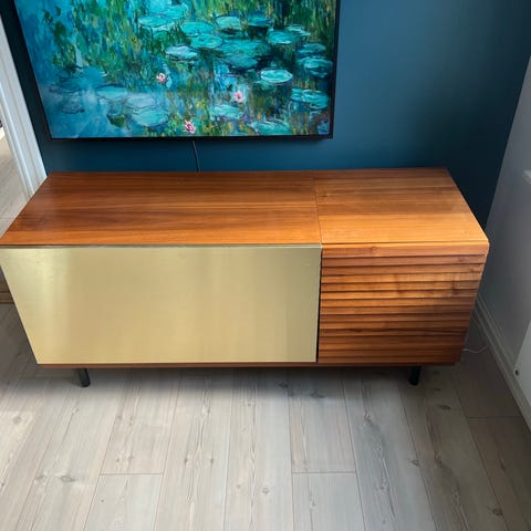 Skjenken er i god stand, men har noen mindre bruksmerker – se bilder. Den nederste skuffen er litt treg med å komme ut, men fungerer helt fint.