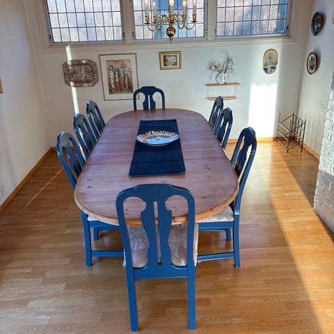 Solid eldre spisestue i klassisk stil selges. Settet består av 8 stoler, spisebord med 2 ileggsplater og romslig skjenk med god oppbevaringsplass.
