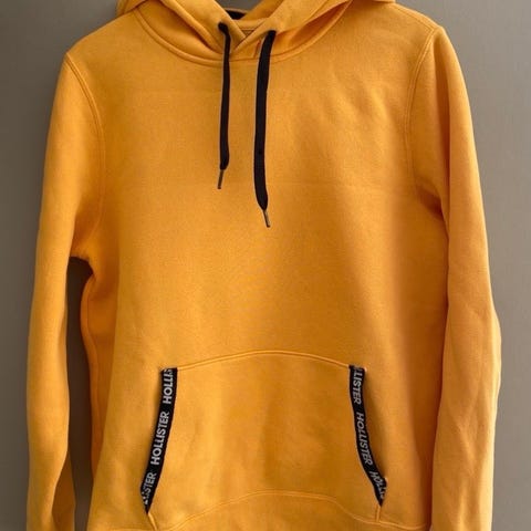 Rød Hollister hettegenser for herre i størrelse S. Den har fast hette med snøring, stor logo på brystet og kengurulomme foran. Hollister-fuglen på brystet er i denim-blå. Passer til hverdagsbruk og fritid. Lengde fra skulder og til kant nederst, 66 cm. Bredde fra under ermene, 55 cm. Bredde linning, 48 cm.