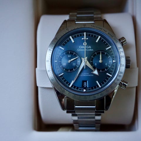 Chronomaster Sport kombinerer elementer fra tidligere Zenith kronograf-referanser, som tri-color skive, pumpe-stil trykknapper og stålarmbånd med en sort keramisk bezel, alt i et moderne 41mm urkasse. Denne versjonen har en blå skive og et integrert stålarmbånd. Drevet av kaliber El Primero 3600, med 1/10 sekunds kronograf.