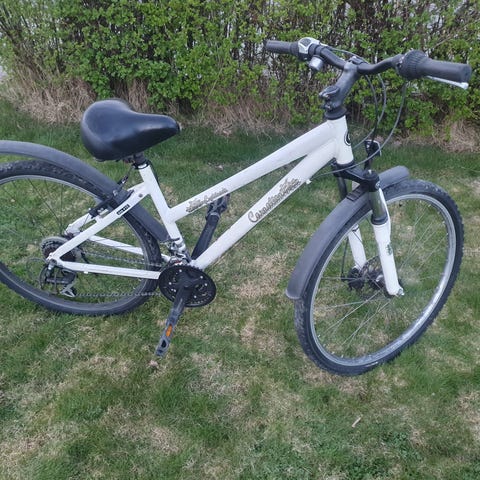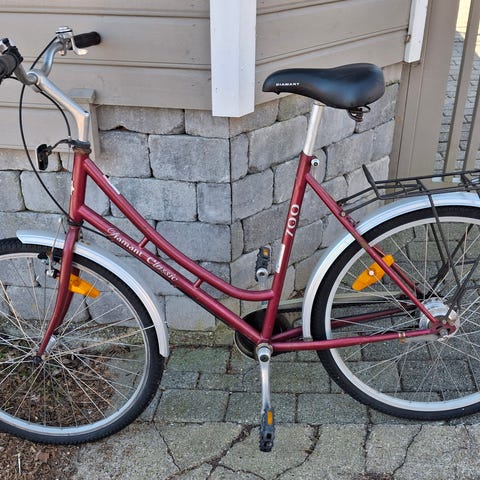Flott hvit og lilla damesykkel. Merke Diamant og rammeste S. Dekkstr 26 og inkludert lys, ringeklokke, sykkel kodelås. 21 shimano, gir . Skjermer på begge hjul. Nesten ikke brukt.ingen rust