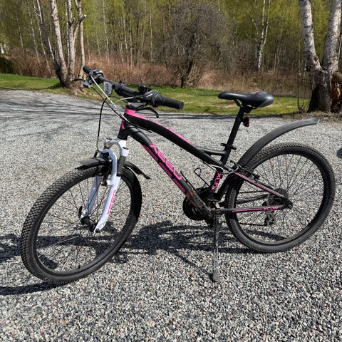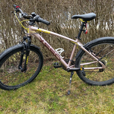 Xeed XCR JR.26 terrengsykkel med 26" hjul. Sykkelen har ramme tilpasset barn/ungdom og er utstyrt med dempegaffel foran. Mønstrede dekk gir grep på grus og lettere terreng. Sykkelen har flatt styre og girsystem med flere gir, egnet til både hverdagssykling og turbruk på vei og sti. Fargen er en lys lillatone med gule detaljer.