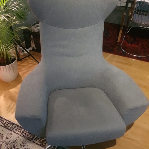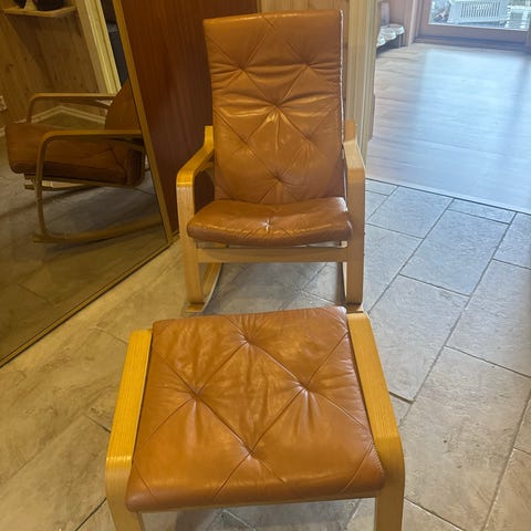 Hjellegjerde siesta med høy rygg selges 3300kr Utrulig gode stoler og sitte i. Er med krakk som er defekt fot. lys brun med hvit ramme