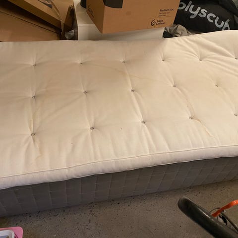 Rammemadrassen 90x200 gis bort. Beina er tatt av for å gjøre den mer kompakt, de kan monteres på igjen.