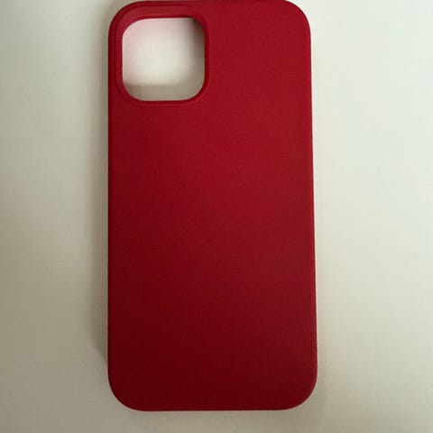 Apple telefondeksel i rød farge. Dekselet har utskjæringer for kamera og knapper, samt en lomme på baksiden som kan brukes til kort eller lignende. Passform og modell er tilpasset en iPhone-modell med trippelkamera, men nøyaktig modell er ikke spesifisert.