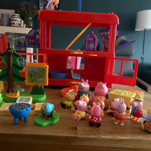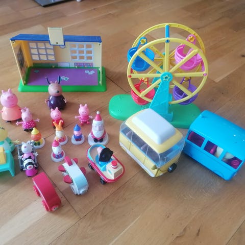 Stor lekesamling med Peppa gris figurer. Noen få figurer mangler noen armer, og sykebilen mangler en dør. Ellers er alt helt. Toget og kranbilen er elektriske med lyd.