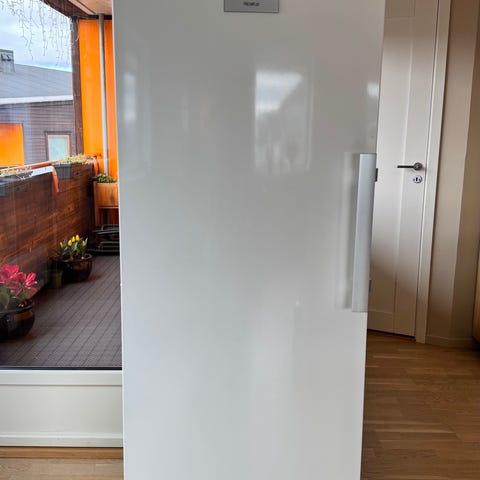 Electrolux fryseskap i hvit utførelse. Frittstående modell med frontdør og vertikalt håndtak. Innvendig er skapet utstyrt med flere gjennomsiktige skuffer og hyller for organisering av frossenvarer. Egnet for bruk på kjøkken, bod eller vaskerom der det er behov for ekstra frysekapasitet. Nøyaktig modellbetegnelse og volum er ikke oppgitt.