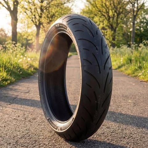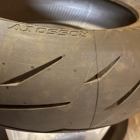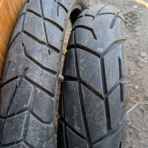 Demokjørt Pirelli MC dekk, fremre og bakre i dimensjonene 90/90-21 og 150/70-18.