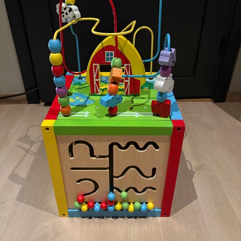 Kuben har flere aktiviteter på hver side, blant annet klosser til formsortering, labyrintspor, kuleramme og klokke med visere. På toppen er det en trådlabyrint med fargerike kuler og små figurer. Leken er egnet for mindre barn til trening av finmotorikk, hånd–øye-koordinasjon og enkel form- og fargelæring.