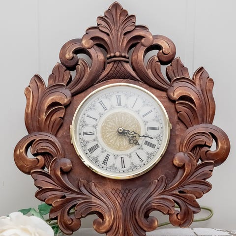 Veggur i solformet design fra tidlig 60 tallet laget i metall med gullfarget overflate. Klokken har rund urskive med romertall og tre visere. Passer som veggklokke i stue, gang eller andre oppholdsrom der man ønsker et dekorativt tidsur på veggen.