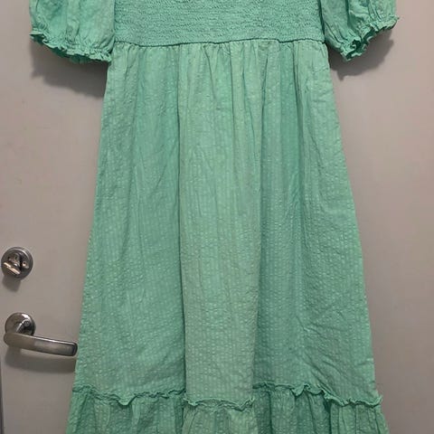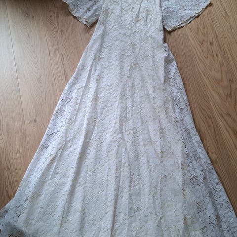 Vintage lang romantisk kjole. Bomull. Blonde/broderte detaljer. Huset på prærien. Prikker og striper. Mål: ca. 42 cm over bysten (det dobbelte rundt), 116 cm fra blondene og helt ned. Ca. 45 cm over midjen (90 rundt).