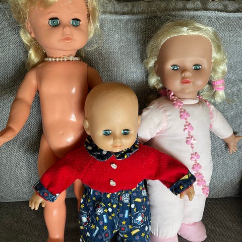 Sett med to dukker med klær fra 1980 tallet. Den største dukken har lyst hår og rød strikket kjole. Hun heter Helene. Den minste dukken er en babylignende dukke med mørkeblå strikket bukse og genser med lyse striper. Han heter Thomas. Passer til lek og rollelek for barn som liker å stelle og kle på dukker. Selges for 200 kr stk