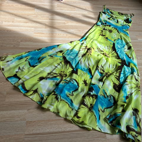 Moods of Norway sommerkjole for dame i størrelse S. Kjolen er laget i polyester med et flerfarget mønster i blant annet røde og blå toner. Den har tynne stropper og fôr på innsiden for bedre passform og komfort. En liten revne i stoffet på innsiden. Se bilde.