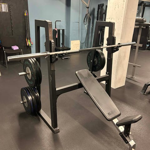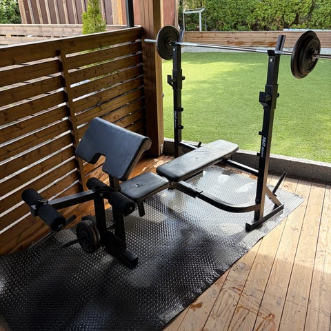 Treningsbenk med stativ og platå bak for spotting. Benken har fast skrå vinkel og integrert stativ for vektstang med tre høydeposisjoner. Selger den med tungt hjerte fordi vi skal flytte og ikke får plass i neste leilighet.