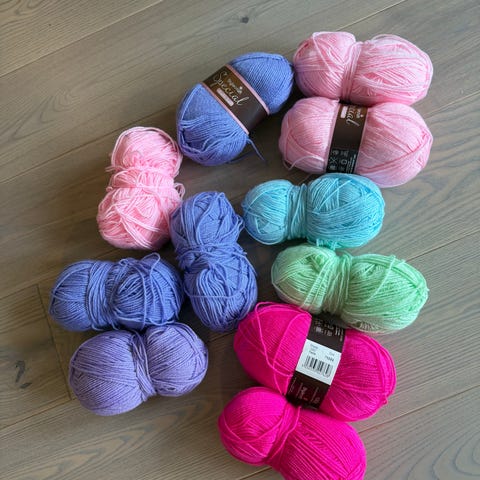 Pakke med garnnøster i flere farger. Bildene viser blant annet rosa, røde, blå, grå, beige, svarte og brune nyanser. Garnet kan brukes til strikking og hekling av plagg, tilbehør og interiørprosjekter. Nærmere informasjon om garntype, materiale og tykkelse fremgår av banderolene på nøstene der dette er lesbart.