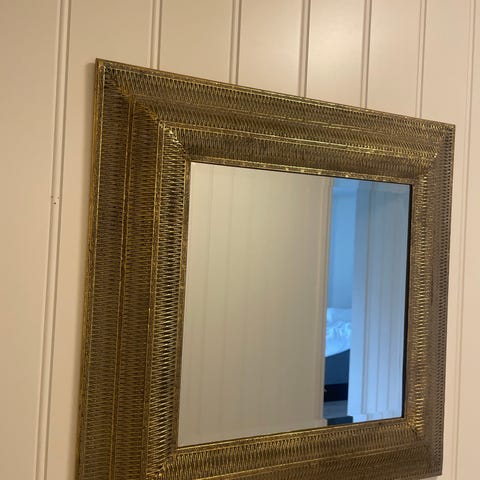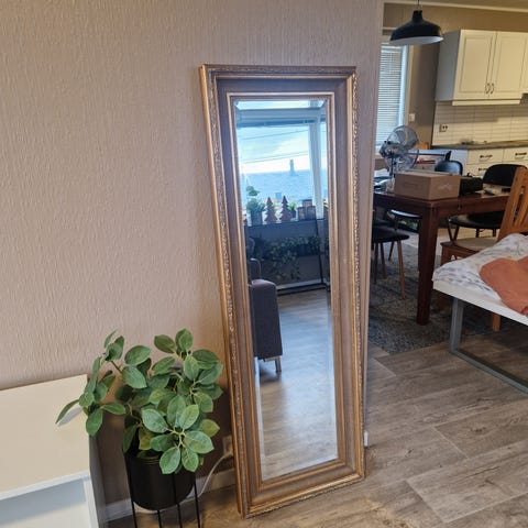 speil med brun treramme. Speilet har en markert ramme med dekorative, tvinnede detaljer langs kanten og i hjørnene. Rammen har trestruktur og en varm brun farge som gir et klassisk uttrykk. Egner seg som helfigurspeil i gang, soverom eller stue, og kan monteres stående eller hengende avhengig av opphengsløsning som brukes. Mål B-87 og H-1,57 fasettslipt speil selges kr 900