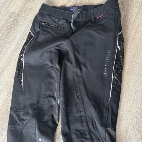 BV Equestrian ridebukse med knegrip i mørk blå farge. Buksa har tettsittende passform og elastisk materiale som gir god bevegelsesfrihet. Silikon-grep langs innsiden av lårene for bedre feste i salen. Forsterket stoff nederst på bena.