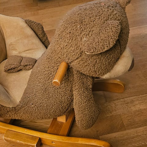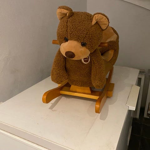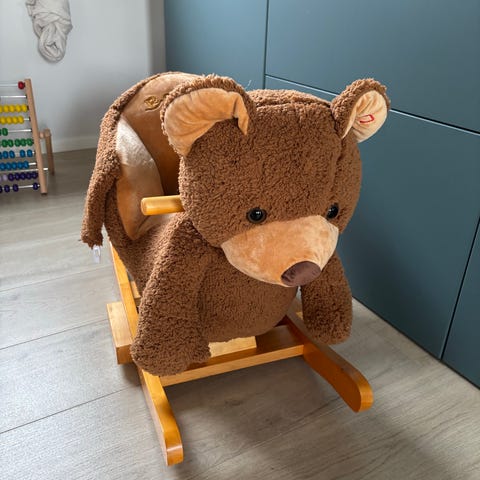 Søt, myk, brun gyngebamse med stolsete med ryggstøtte og sele. Bamsen spiller musikk når du trykker på den ene poten.🧸🎵