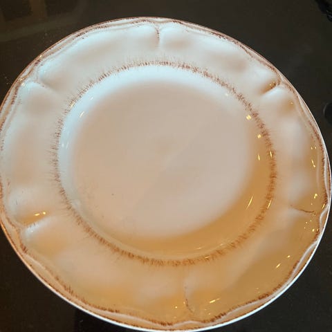 6 Wawel store tallerkene i hvitt porselen med dekorert kant og gullkant. Tallerkenen har lett bølget form langs kanten med preget mønster. Passer som middagstallerken eller serveringstallerken. Produsert i Polen, merket «Wawel Made in Poland» på undersiden.