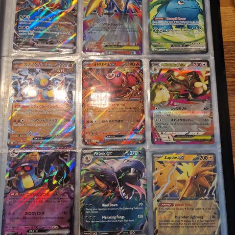 Pokémon samlekort blandet lot med ulike korttyper. Bildene viser blant annet flere holografiske og full art-kort, samt vanlige basis- og utviklingskort. Kortene ligger i plastlommer i en perm på bildene, men det er kun kortene som beskrives her.