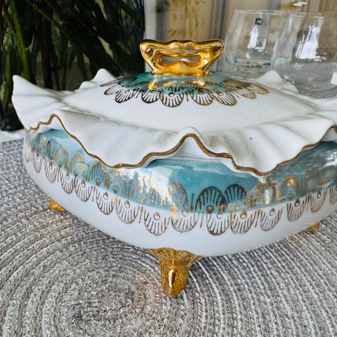 Wawel sausnebb med fat i hvitt porselen med gullkant. Settet består av et sausnebb fast fat i samme dekor. Porselenet har lett bølget kant og diskret relieffdekor langs sidene. Produsert i Polen, merket "Wawel Made in Poland" på undersiden. Egnet til servering av saus og andre varme eller kalde flytende tilbehør ved borddekking.