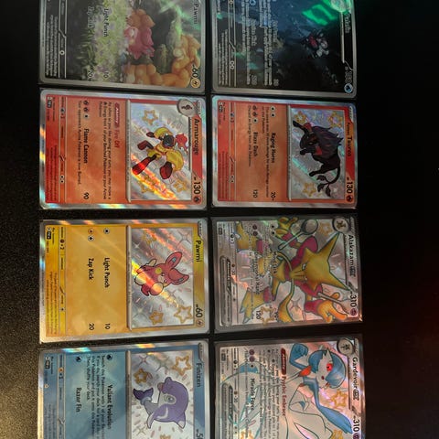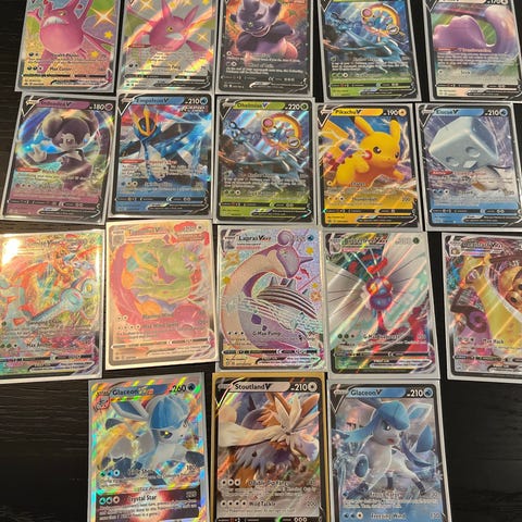 Pokémon samlekort GX og EX holografiske. Kortene ligger i plastlommer i en perm på bildene. Motivene inkluderer flere ulike Pokémon med høy HP og spesialangrep. Kortene er holografiske/foil og passer til samling eller spill i Pokémon Trading Card Game. Antall, språk, årgang og sett kan kontrolleres nærmere ved behov ved å zoome inn på bildene eller sammenligne med egen kortliste.