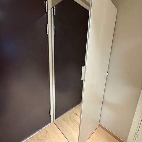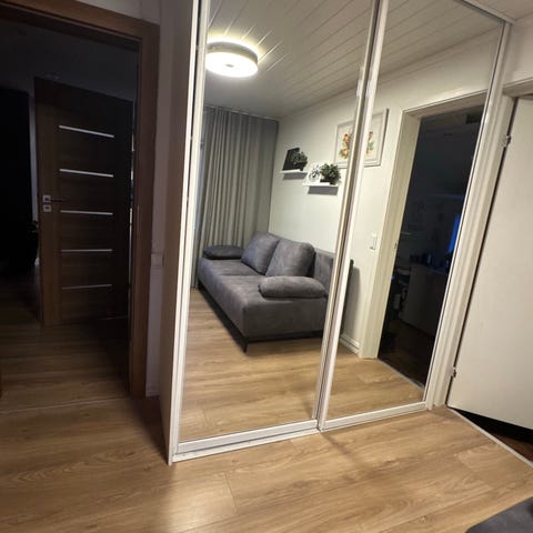 Praktisk og romslig garderobeskap med tre skyvedører, hvor to av dørene har store speil. Speilene gir rommet en større og lysere følelse samtidig som de er praktiske i hverdagen.