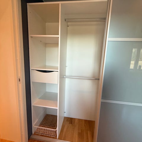 Skapet har god oppbevaringsplass med hyller og stang til klær. Perfekt til soverom, gang eller garderoberom. Skyvedørene gjør at skapet passer godt også i rom med begrenset plass foran.
