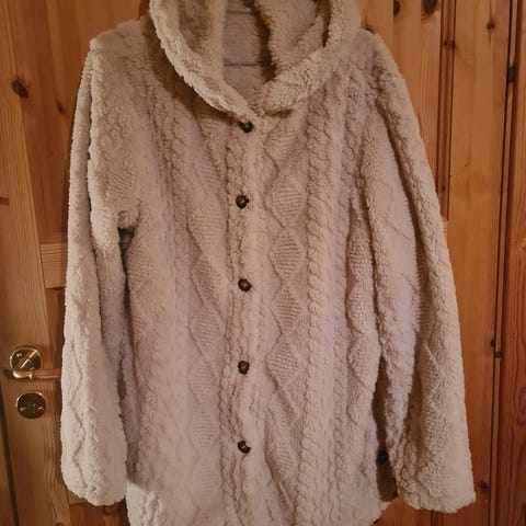 Selger en utrolig myk og komfortabel kåpe i en dyp og elegant aubergine-farge (mørk lilla). Kåpen har et moderne "teddy"-utseende og er laget av en deilig alpakka-blanding som holder deg god og varm.