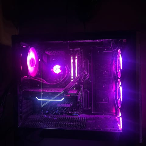 MSI stasjonær PC med gjennomsiktig sidepanel og RGB-belysning i kabinettvifter og komponenter. Kabinettet har flere RGB-vifter innvendig, samt lys rundt kjøleløsningen på prosessoren. Egnet som stasjonær datamaskin til generell bruk og gaming med høye grafikker