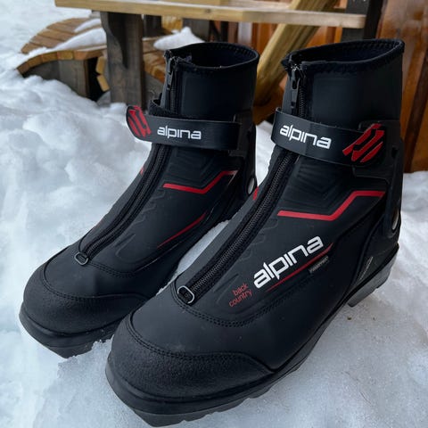 Alpina langrennsstøvler i svart farge. Støvlene har høy ankel for bedre støtte og snøring foran. Sålen er tilpasset moderne langrennsbindinger (se bilder for detaljert såleprofil). Yttermaterialet er laget for å tåle fukt og kulde, og innersiden har polstring rundt ankel for økt komfort. Egner seg til bruk på langrennsturer og trening på ski. Se bilder for nærmere detaljer om modell og tilstand.