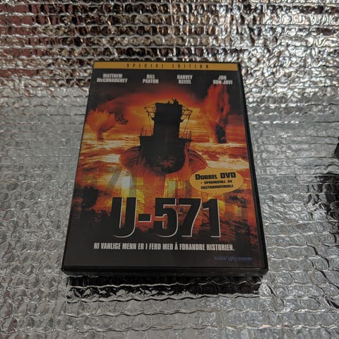 U-571 DVD. Spillefilm i DVD-format med krigs- og ubåttema. Omslaget viser at filmen har norsk og svensk teksting.