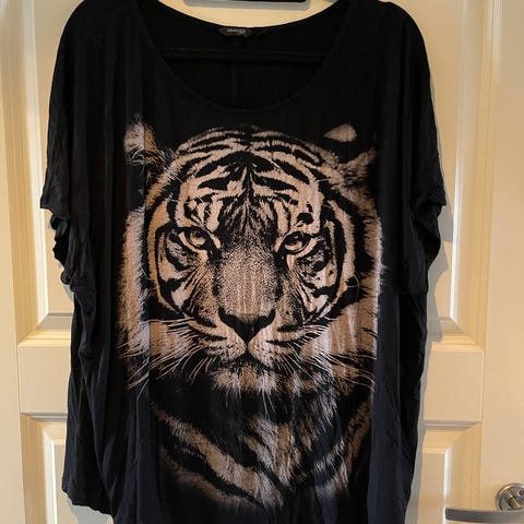 Primark topp for dame i størrelse 36. Toppen er svart og laget av polyester. Den har kort erm og stort tigertrykk foran. Passer til hverdagsbruk og kan kombineres med både bukser og skjørt. Materiale ifølge lappen: 100 % polyester. Vaskes etter anvisning på merkelapp.