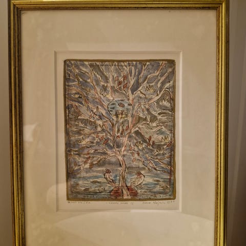 Innrammet bilde i rektangulært format med gullfarget, profilert treramme. Bildet viser et fargerikt motiv med soloppgang eller solnedgang og figurer i forgrunnen. På rammen foran er det en liten metallplate med teksten «E. Munch». Baksiden har opphengsfeste og lerret spent opp på blindramme. Egnet som veggdekor i stue, gang eller andre oppholdsrom.