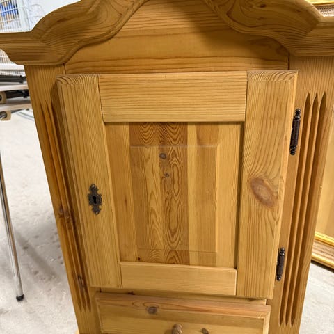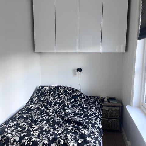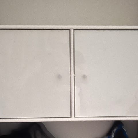 Veggskap en er 120 lengde en 60cm lengde. Høyde40 cm og .dybde 42cm og hvit farge. Skapet egnet for montering høyt på vegg, typisk over tv skap. Innvendig er det åpent rom uten hyller på bildene.