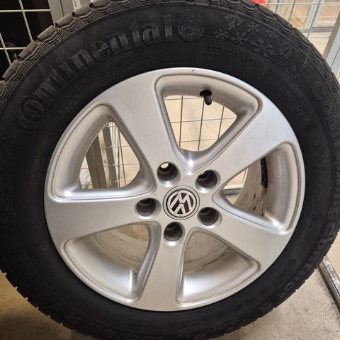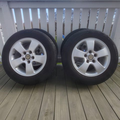Selger en komplett sommerhjulpakke som passer til Volkswagen. Det er originale felger. Runde og fine. 2 stk Vredestein brukte dekk som holder 4.1 mm og 4.3 mm mønsterdybde