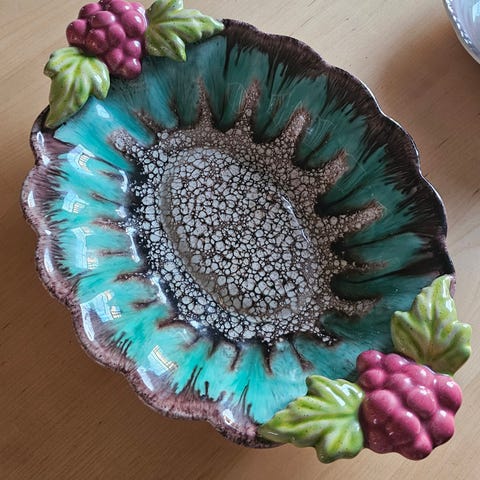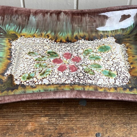 Spektra 108/25 keramisk serveringsfat med dekorativt flerfarget mønster. Fatet har en rektangulær form med blomster- og bladmotiv i midten, omgitt av brune, gule og grønne nyanser. Egnet for servering og dekorasjon. NB! Har et lite skår under.