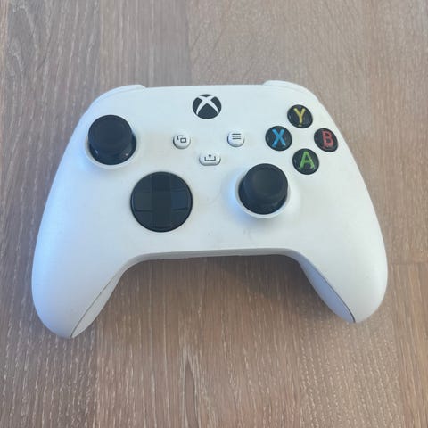 Xbox trådløs kontroller i rød og hvit farge. Standard layout med to analoge styrespaker, retningsknapper, fire frontknapper, skulderknapper og triggere. Kontrolleren har tilkobling via trådløs Xbox-teknologi og kabeltilkobling i front. Egnet til bruk med kompatible Xbox-konsoller og enheter som støtter Xbox-kontrollere.