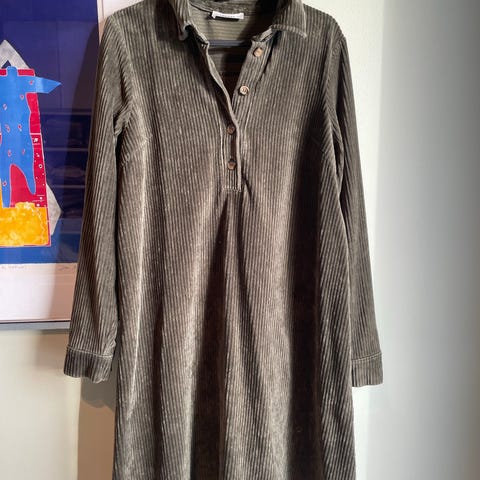 MSCH Copenhagen hverdagskjole for dame i størrelse L. Kjolen er grønn og har lange ermer. Den har skjortekrage og knepping øverst foran.