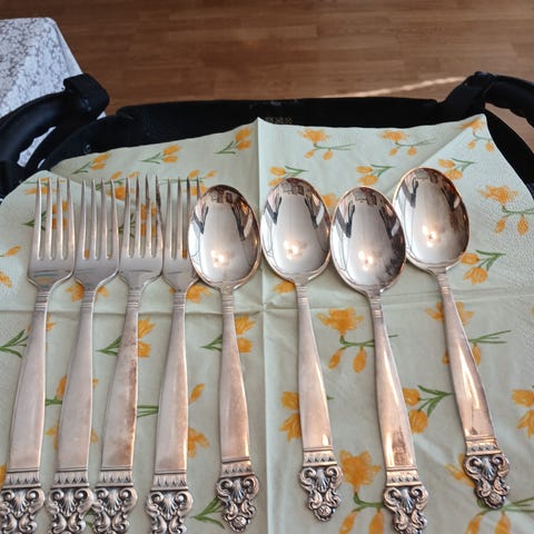 Dessert skjeer og kakespade sølvplett selges for 1500,-