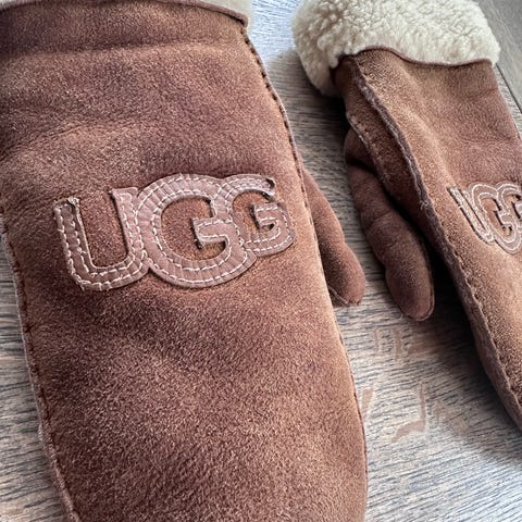UGGfluff Mitten med logo-tape i myk fleece, med et parti i håndflaten i ekte skinn. Mye og fluffy.