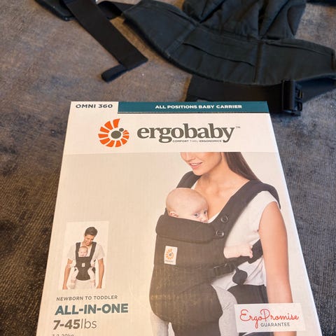 Ergobaby Omni Deluxe bæreselle i svart farge. All-in-one bæresystem som kan brukes fra nyfødt til småbarn. Bæresellen har flere bæreposisjoner, inkludert mage, hofte og rygg, og er utformet for å gi støtte til både barn og bærer. Justerbare stropper og belter gjør det mulig å tilpasse passformen. Egnet for bruk fra 0–4 år, avhengig av barnets vekt og størrelse, innenfor produsentens anbefalinger.