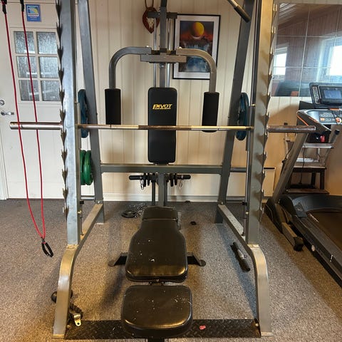 Technogym, kan belaste øvelser for rygg, mage, ben og armer ved å legge på flere vekter, se bilder. Ikke vekter eller stang inkludert til denne prisen