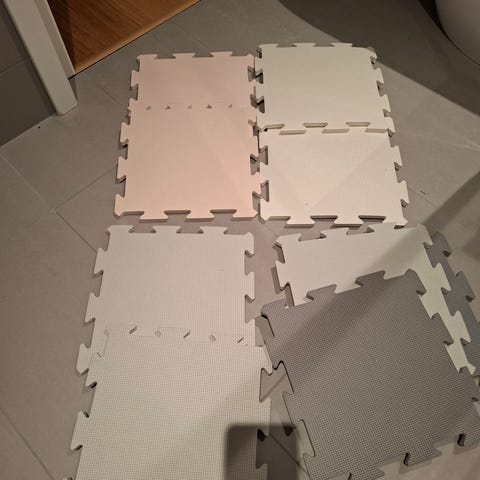 Fin Lekematte i str 1 m x1 m selges. Lekematten er i fargene lys rosa og lilla. Lekematten er fra merket Yngri, og ble kjøpt ny på barnas hus. Nypris: 269kr.