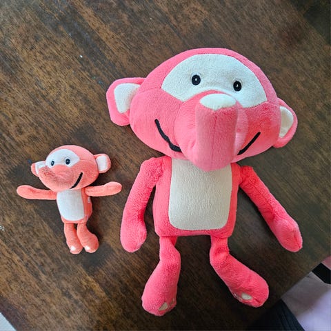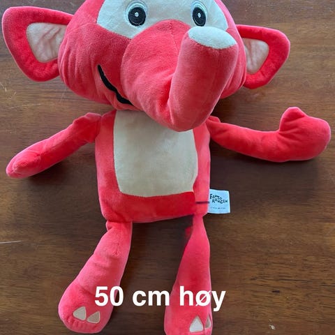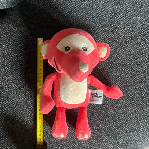 Fantorangen kosedyr i mykt stoff. Figuren er rød med lyse felt på mage, ansikt og føtter. Høyden er omtrent 40 cm, målt fra hode til fot. Egner seg som kosebamse eller lekefigur for barn.