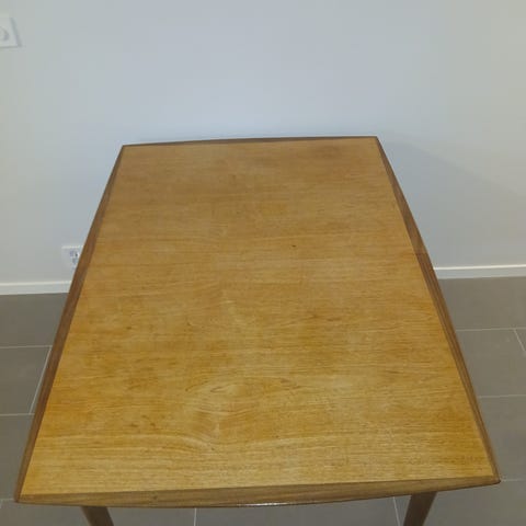 Spisebord i teak med rektangulær bordplate. To ileggsplater a 34 cm medfølger. Tidlig 1960. Passer som spisebord på kjøkken eller i stue, og gir plass til flere stoler rundt bordet. Egnet til daglig bruk som spise- og/eller arbeidsbord. To stoler medfølger, hvis ønskelig.