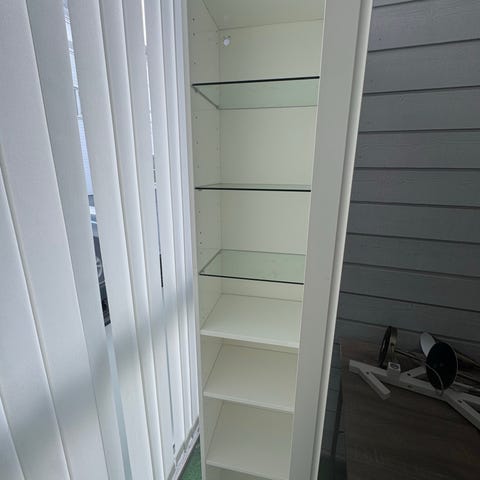 Skapet har speildører på fronten og innvendig hvit overflate. Innvendig er det flere glasshyller og trygg stikontakt