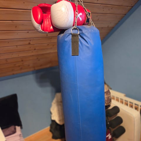 Boksesekk med tilhørende boksehansker. Sekken er svart og henges opp med stropper. Hanskene er røde. Egnet til boksing og annen slagtrening hjemme eller på treningsrom.