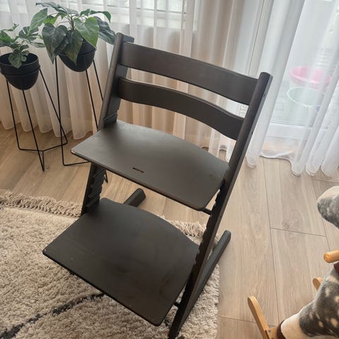 Pent bruk og meget praktisk Stokke tripp trapp med baby sett selges. Brun farge og i veldig god stand