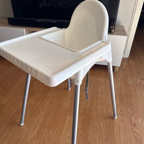 IKEA høy barnestol i hvit plast med metallben. Stolen har avtagbart brett og enkel sitteenhet med ryggstøtte. Det følger med sikkerhetssele festet under setet. Egnet som spise- og sitteplass for små barn ved bordet. Lett å rengjøre takket være glatte overflater og enkel konstruksjon.